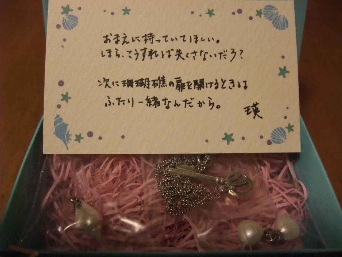 でも、これ…よく考えてみると…とっても高いよね。 しかーし、この『珊瑚礁の鍵のネックレス』には、原価だけではなく そして、これを見るたびに、手に渡されるあの瑛君の告白シーンを思い出すんです。 本当に欲しくて欲しくてたまらなかったもの… 「ありがとう!瑛君!夢をありがとう…。」